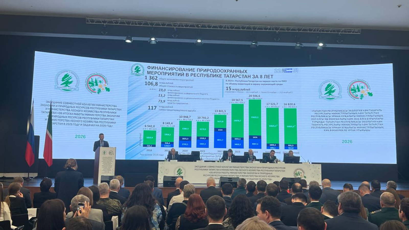 Министр экологии и природных ресурсов Республики Татарстан Азат Зиганшин в своем докладе отметил, что последние 8 лет в природоохранные проекты Татарстана было вложено почти 107 млрд рублей, из них в 2025-м и 2024-м - по 15 миллиардов. "По данному показателю республика опережает Москву и Санкт-Петербург и входит в топ-5 регионов России по объему инвестиций", - указал министр.